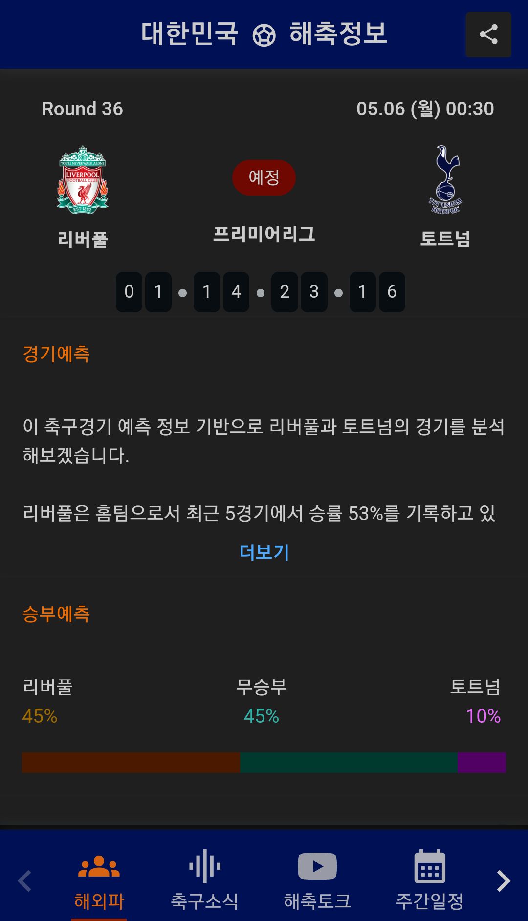 이 축구경기 예측 정보 기반으로 리버풀과 토트넘의 경기를 분석해보겠습니다.