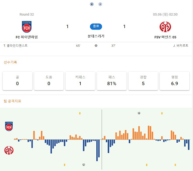 - 골 외에도 여러 카드가 주어졌는데, FSV 마인츠 05의 L. 바헤이루와 조나단 버카르트, 도미닉 코어가 각각 경고 카드를 받았으며, FC 하이덴하임의 베네딕트 김버와 팀 클라인디엔스트도 경고 카드를 받았습니다.