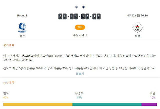 이 축구경기는 갠트와 오에이치 르벤(OH Leuven) 간의 경기로 분석됩니다. 갠트는 홈팀이며, 예측 정보에 따르면 상당히 강한 모습을 보이고 있습니다.