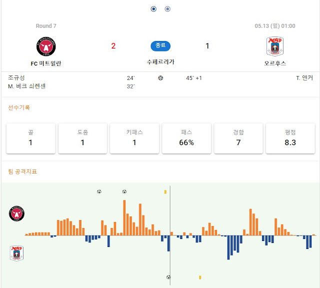 - **24분**: FC 미트윌란의 조규성이 경기의 첫 골을 기록하며 리드를 가져갑니다.