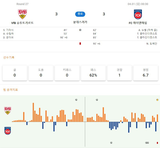 VfB 슈투트가르트와 FC 하이덴하임의 경기는 3-3으로 무승부로 마쳤습니다.