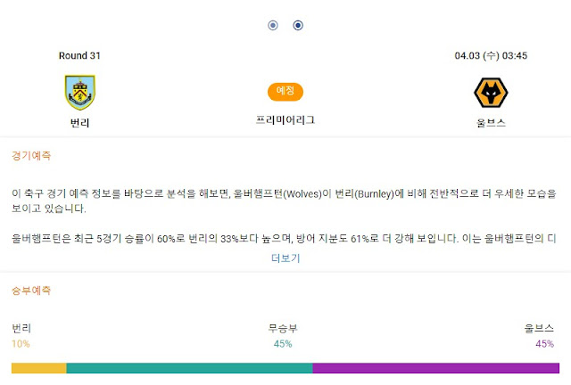 이 축구 경기 예측 정보를 바탕으로 분석을 해보면, 울버햄프턴(Wolves)이 번리(Burnley)에 비해 전반적으로 더 우세한 모습을 보이고 있습니다.