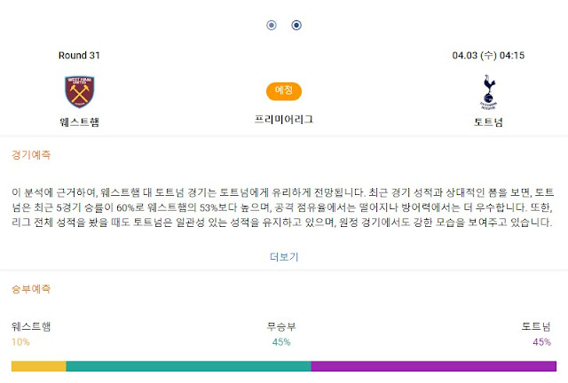 이 분석에 근거하여, 웨스트햄 대 토트넘 경기는 토트넘에게 유리하게 전망됩니다. 최근 경기 성적과 상대적인 폼을 보면, 토트넘은 최근 5경기 승률이 60%로 웨스트햄의 53%보다 높으며, 공격 점유율에서는 떨어지나 방어력에서는 더 우수합니다. 또한, 리그 전체 성적을 봤을 때도 토트넘은 일관성 있는 성적을 유지하고 있으며, 원정 경기에서도 강한 모습을 보여주고 있습니다.
