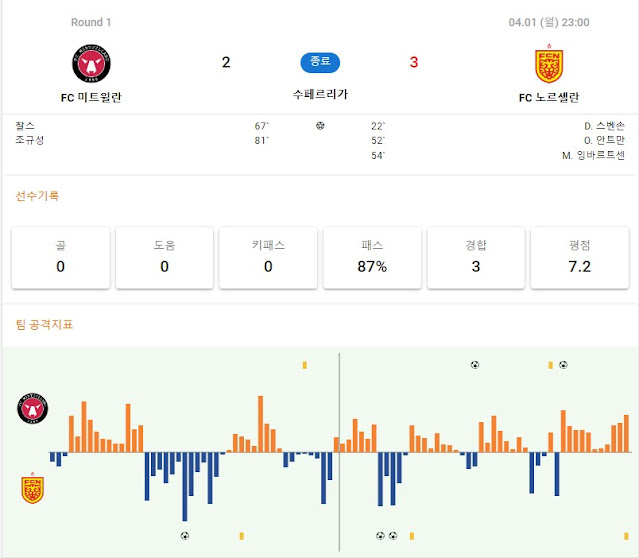 - 22분 FC 노르셸란 선수 D. 스벤손 득점