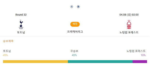 그러나 무승부 가능성도 45%로 예측되어, 비록 토트넘의 우위가 예상되지만 완전히 한쪽의 승리를 보장할 수 있는 경기는 아닐 것 입니다.
