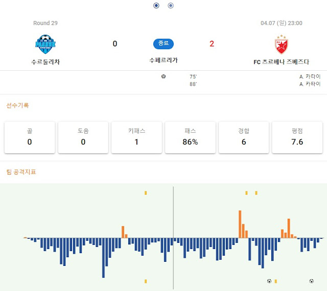 경기 결과, FC 츠르베나 즈베즈다가 수르둘리차를 2-0으로 이겼습니다. 경기는 수르둘리차에게 힘든 경기였고, FC 츠르베나 즈베즈다의 우세를 명확하게 보여줍니다. 공격면에서 수르둘리차는 골문을 향해 3번의 유효 슈팅을 기록했지만, FC 츠르베나 즈베즈다는 4번의 유효 슈팅을 기록했습니다. 이외의 다른 데이터, 예를 들어 볼 점유율에서도 FC 츠르베나 즈베즈다가 70%로 수르둘리차(30%)를 압도했습니다.