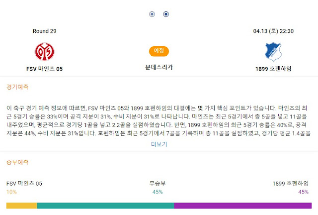 이 축구 경기 예측 정보에 따르면, FSV 마인츠 05와 1899 호펜하임의 대결에는 몇 가지 핵심 포인트가 있습니다. 마인츠의 최근 5경기 승률은 33%이며 공격 지분이 31%, 수비 지분이 31%로 나타납니다. 마인츠는 최근 5경기에서 총 5골을 넣고 11골을 내주었으며, 평균적으로 경기당 1골을 넣고 2.2골을 실점하였습니다. 반면, 1899 호펜하임의 최근 5경기 승률은 40%로, 공격 지분은 44%, 수비 지분은 31%입니다. 호펜하임은 최근 5경기에서 7골을 기록하며 총 11골을 실점하였고, 경기당 평균 1.4골을 넣고 2.2골을 실점했습니다.
