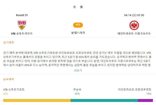 두 팀의 직전 대결 기록을 보면 아인트라흐트 프랑크푸르트가 우위를 보이지만, 현재 양 팀의 컨디션과 홈/원정 경기의 차이를 고려할 때, 이번 경기는 VfB 슈투트가르트가 아인트라흐트 프랑크푸르트를 상대로 우위를 점할 가능성이 높아 보입니다.