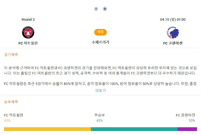 이 분석에 근거하여 FC 미트윌란과 FC 코펜하겐의 경기를 전망해보면, FC 미트윌란이 상당히 유리한 위치에 있는 것으로 보입니다. 이는 홈팀인 FC 미트윌란의 최근 경기 성적, 공격력, 수비력 등 여러 통계들이 FC 코펜하겐보다 더 우수하기 때문입니다.