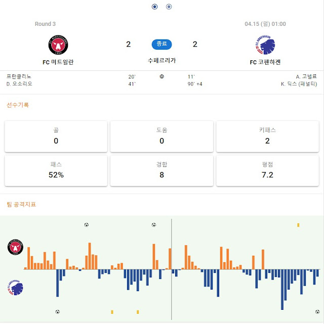 - 유효 슈팅과 코너킥, 공격적인 면에서 코펜하겐이 약간 우위에 있었지만, 미트윌란은 효율적인 공격과 결정력을 바탕으로 동점을 얻어냈습니다.