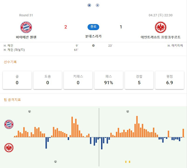 두 팀간 경기는 명확히 바이에른 뮌헨의 우위를 보여주었지만, 아인트라흐트 프랑크푸르트의 탄탄한 수비와 골키퍼 트랩의 뛰어난 몸놀림이 없었다면 더 클 수 있는 점수 차이를 막는데 큰 역할을 했습니다.